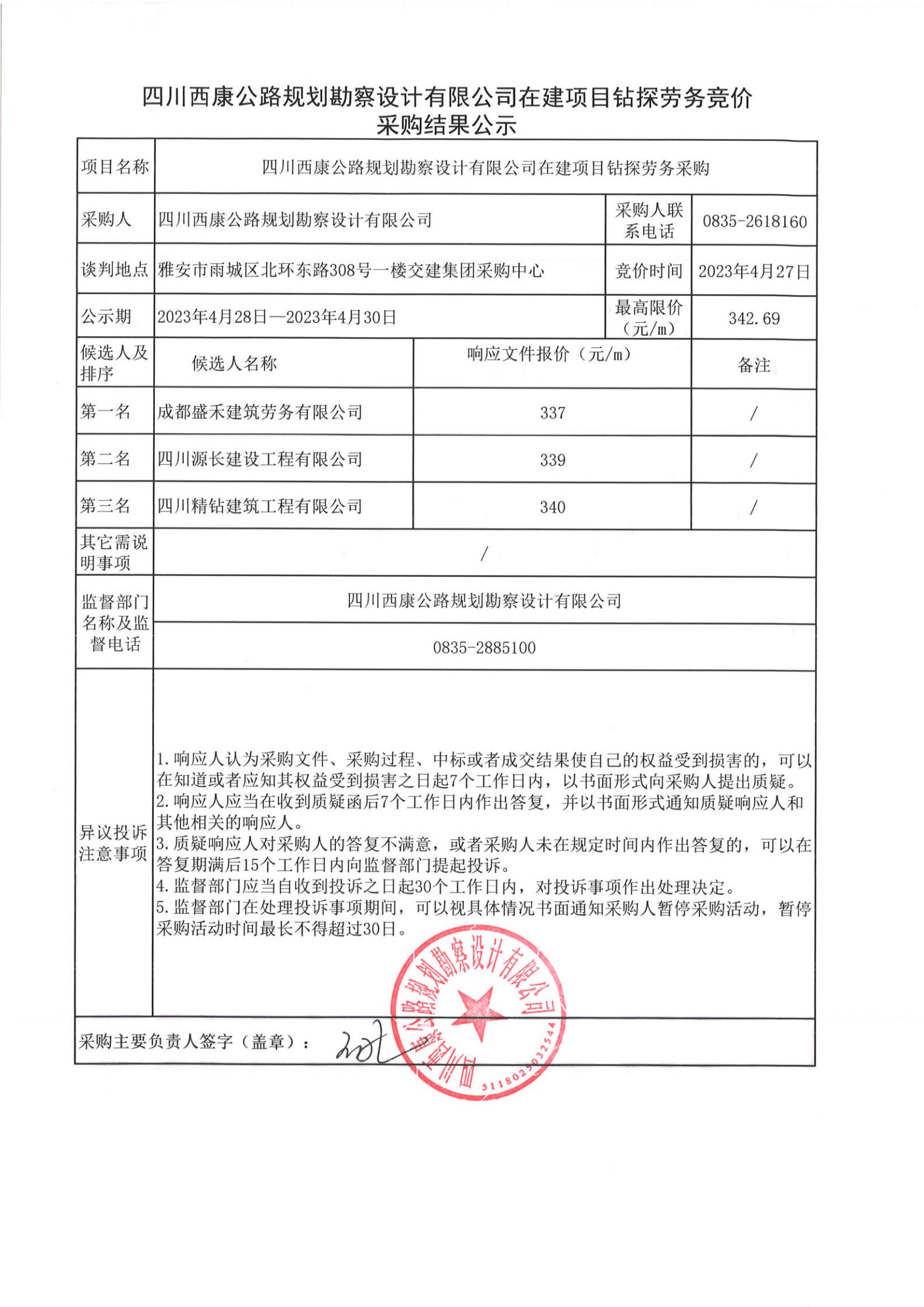 四川西康公路規(guī)劃勘察設(shè)計(jì)公司在建項(xiàng)目鉆探勞務(wù)競(jìng)價(jià)采購結(jié)果公示