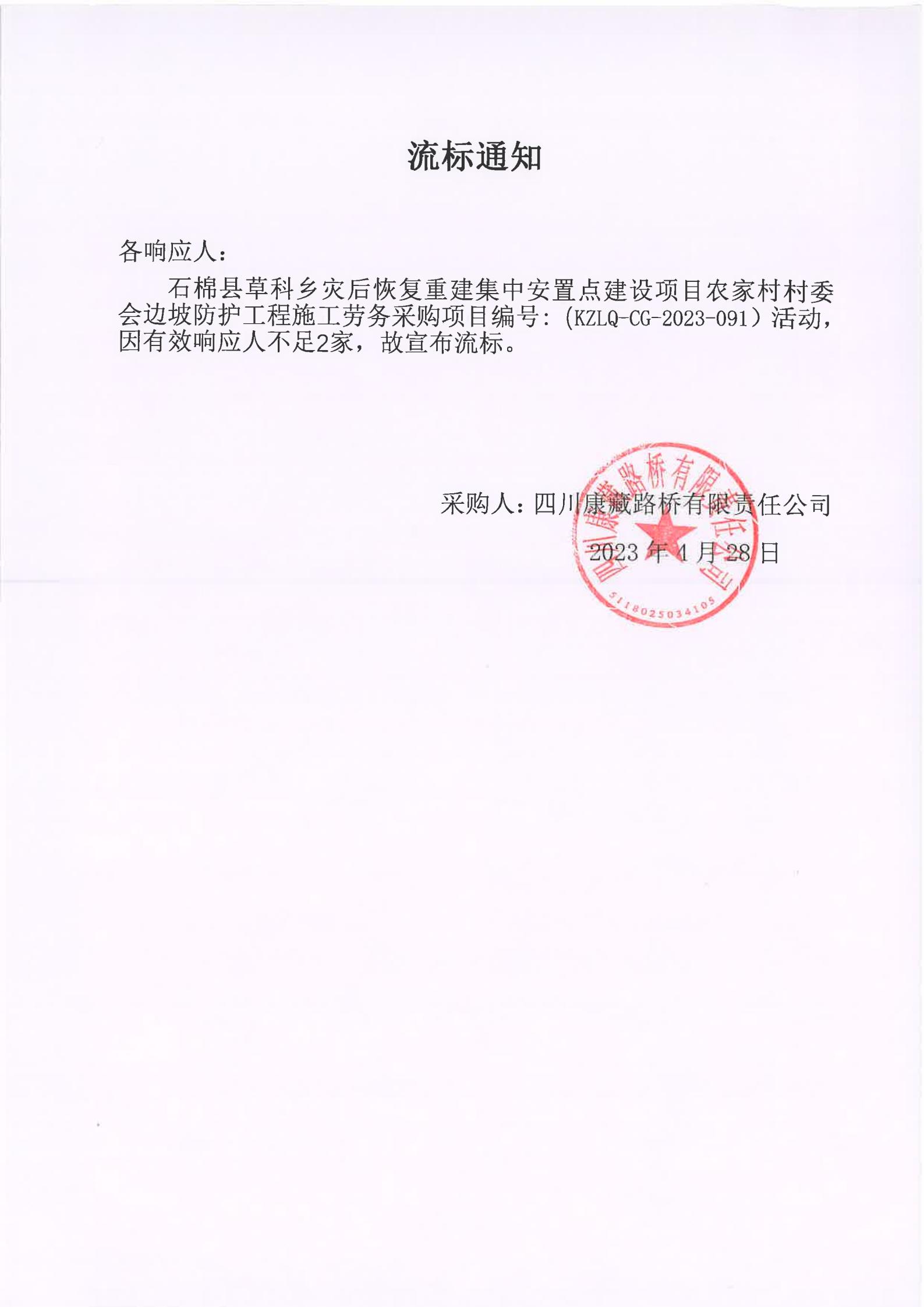 四川康藏路橋有限責(zé)任公司石棉草科鄉(xiāng)災(zāi)后恢復(fù)重建集中安置點(diǎn)建設(shè)項(xiàng)目農(nóng)家村村委會邊坡防護(hù)工程施工勞務(wù)流標(biāo)通知
