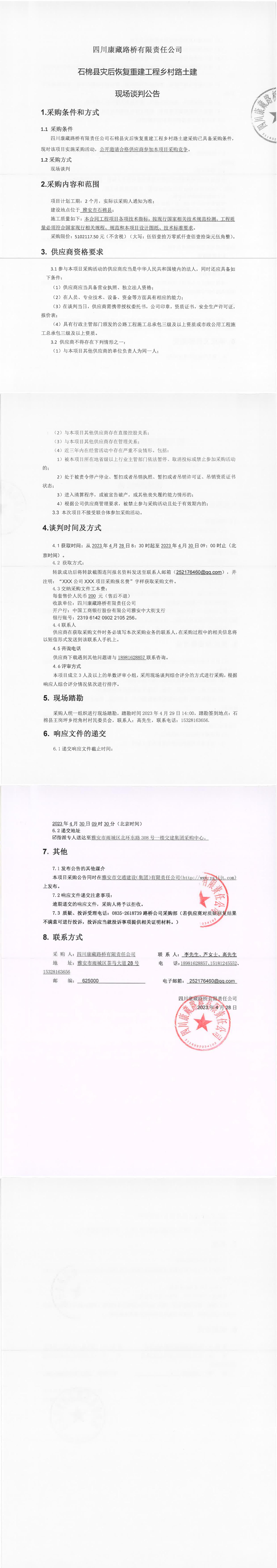 四川康藏路橋有限責(zé)任公司石棉縣災(zāi)后恢復(fù)重建工程鄉(xiāng)村路土建現(xiàn)場(chǎng)談判公告