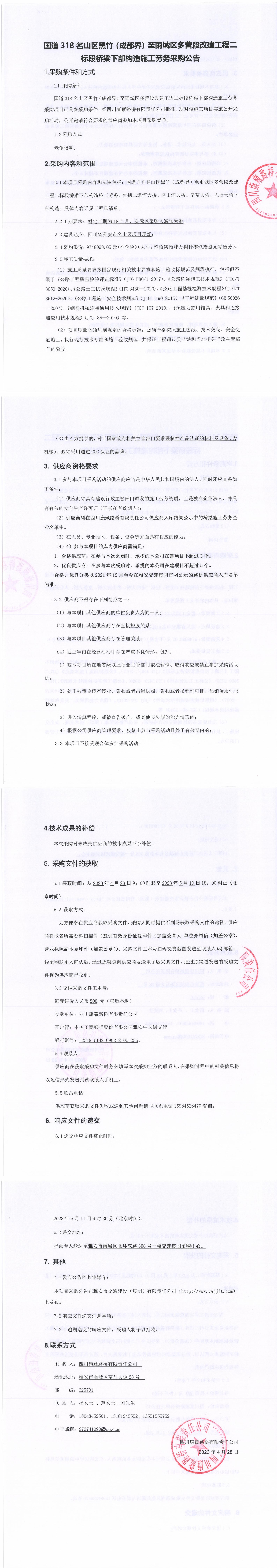 四川康藏路橋有限責(zé)任公司國(guó)道318名山區(qū)黑竹(成都界)至雨城區(qū)多營(yíng)段改建工程一標(biāo)段橋梁施工勞務(wù)采購(gòu)公告
