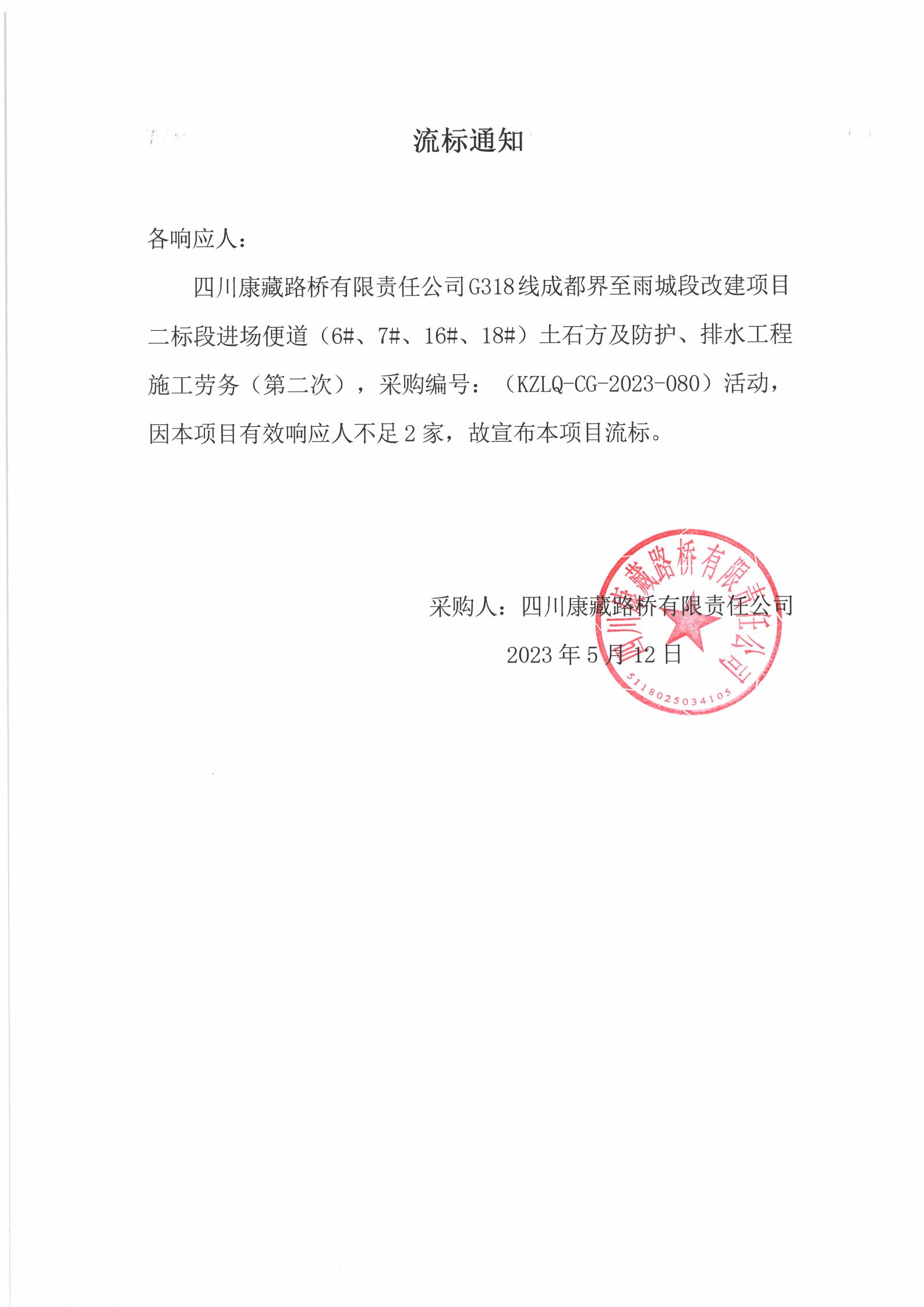 四川康藏路橋有限責(zé)任公司G318線成都至雨城段改建項目二標(biāo)段進(jìn)場便道(6#、7#、16#、18#)土石方及防護(hù)、排水工程施工勞務(wù)(第二次)流標(biāo)通知