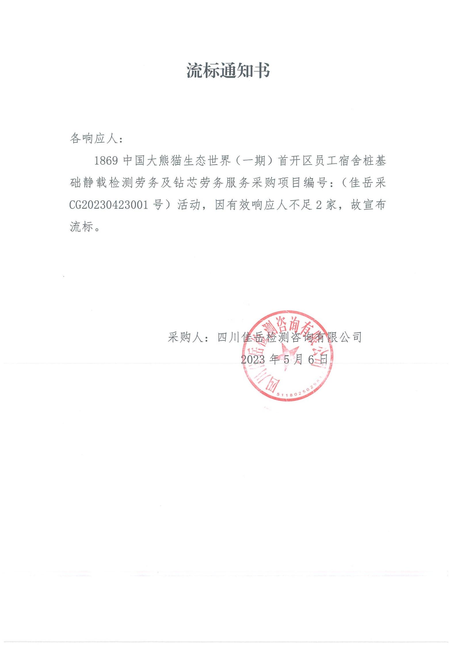四川佳岳檢測咨詢有限公司1869中國大熊貓生態(tài)世界(一期)首開區(qū)員工宿舍樁基礎靜載檢測勞務及磚芯庫勞務服務流標通知