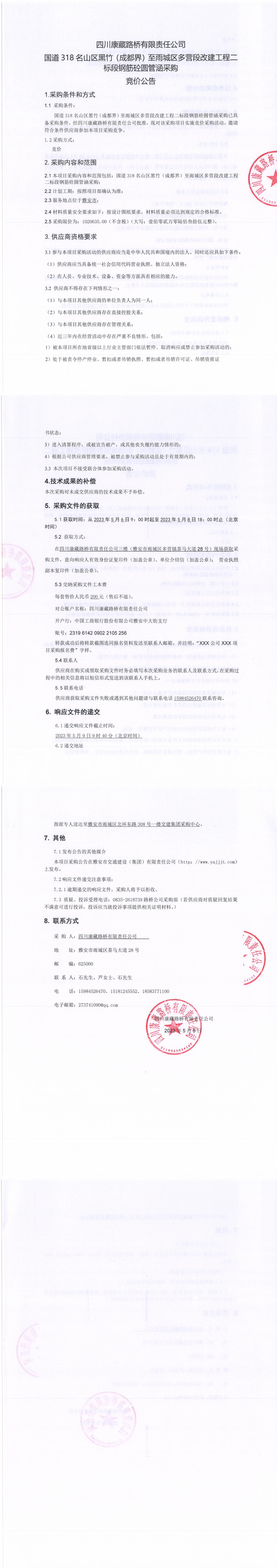 四川康藏路橋有限責(zé)任公司國道318名山區(qū)黑竹(成都界)至雨城區(qū)多營段改建工程二標(biāo)段鋼筋砼圓管涵采購競價公告