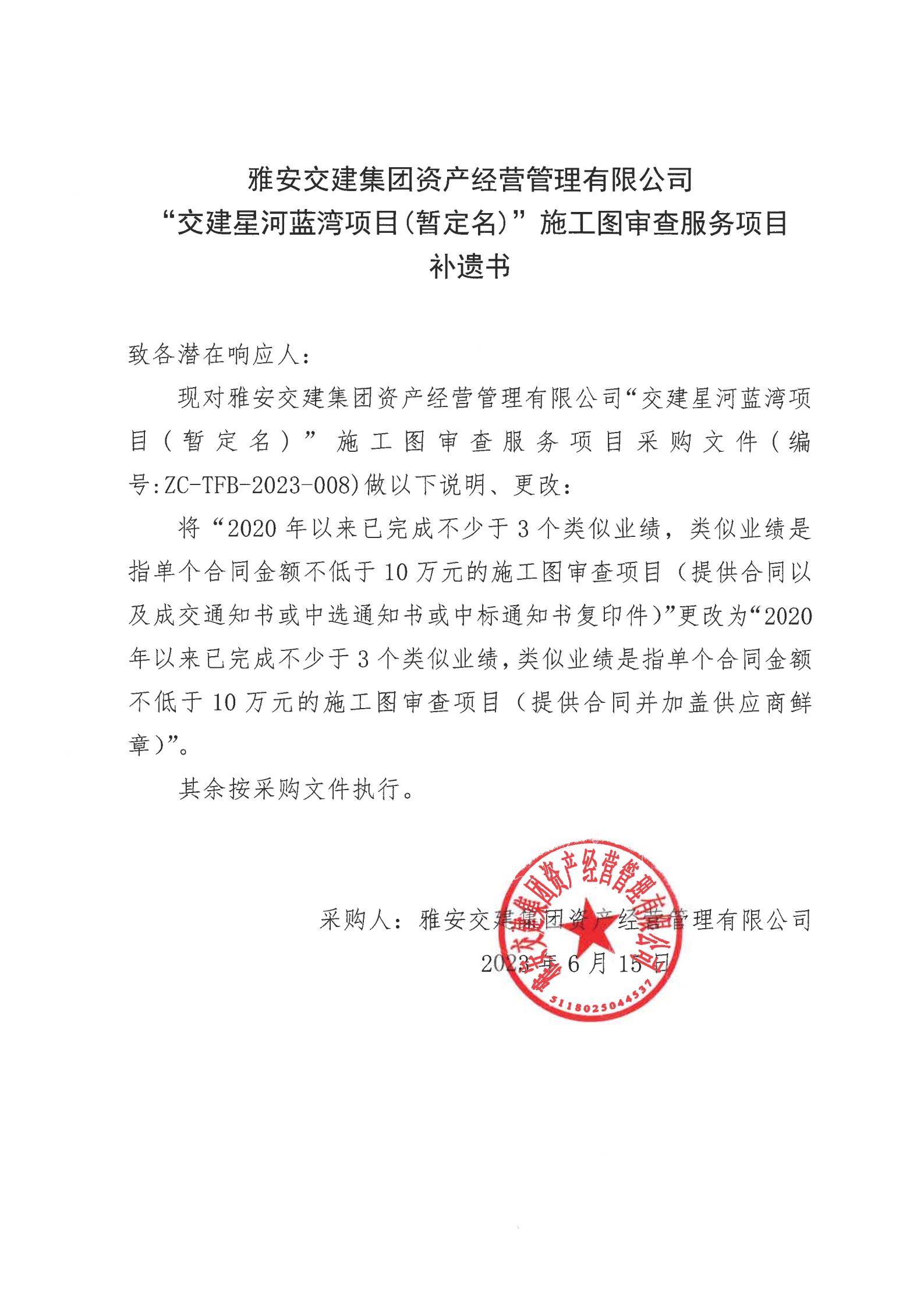 雅安交建集團(tuán)資產(chǎn)經(jīng)營(yíng)管理有限公司“交建星河藍(lán)灣項(xiàng)目(暫定名)”施工圖審查服務(wù)項(xiàng)目采購(gòu)補(bǔ)遺書