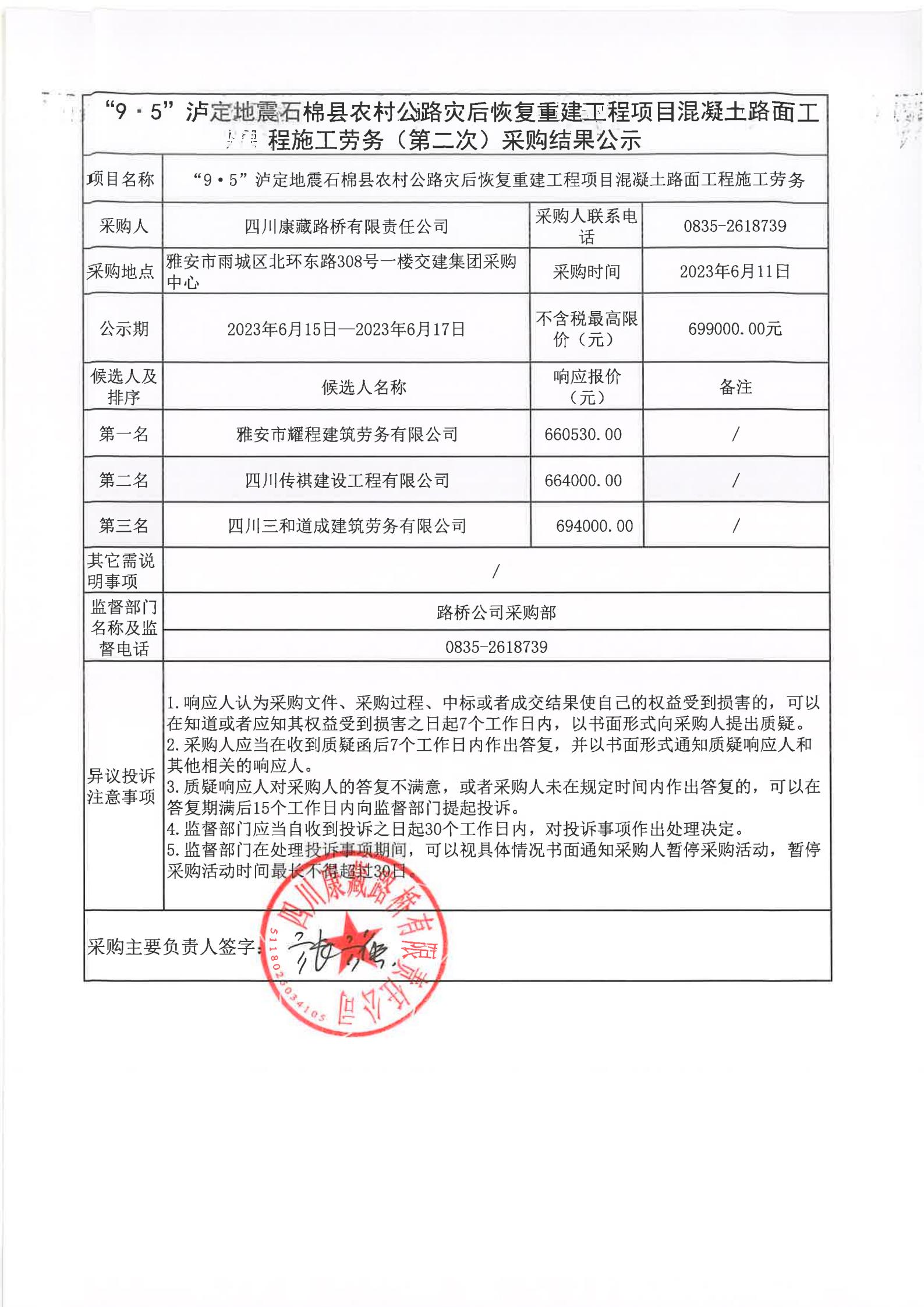 四川康藏路橋有限責任公司“9·5”瀘定地震石棉縣農(nóng)村公路災(zāi)后恢復重建工程項目混凝土路面工程施工勞務(wù)采購(第二次)結(jié)果公示