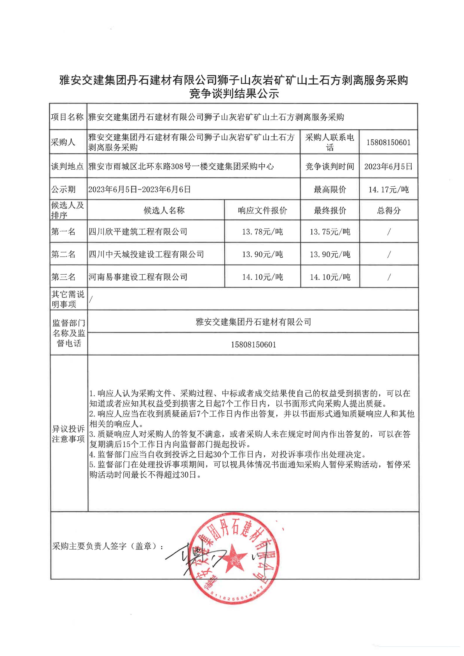 雅安交建集團(tuán)丹石建材有限公司獅子山灰?guī)r礦礦山土石方剝離服務(wù)采購競(jìng)爭(zhēng)談判結(jié)果公示