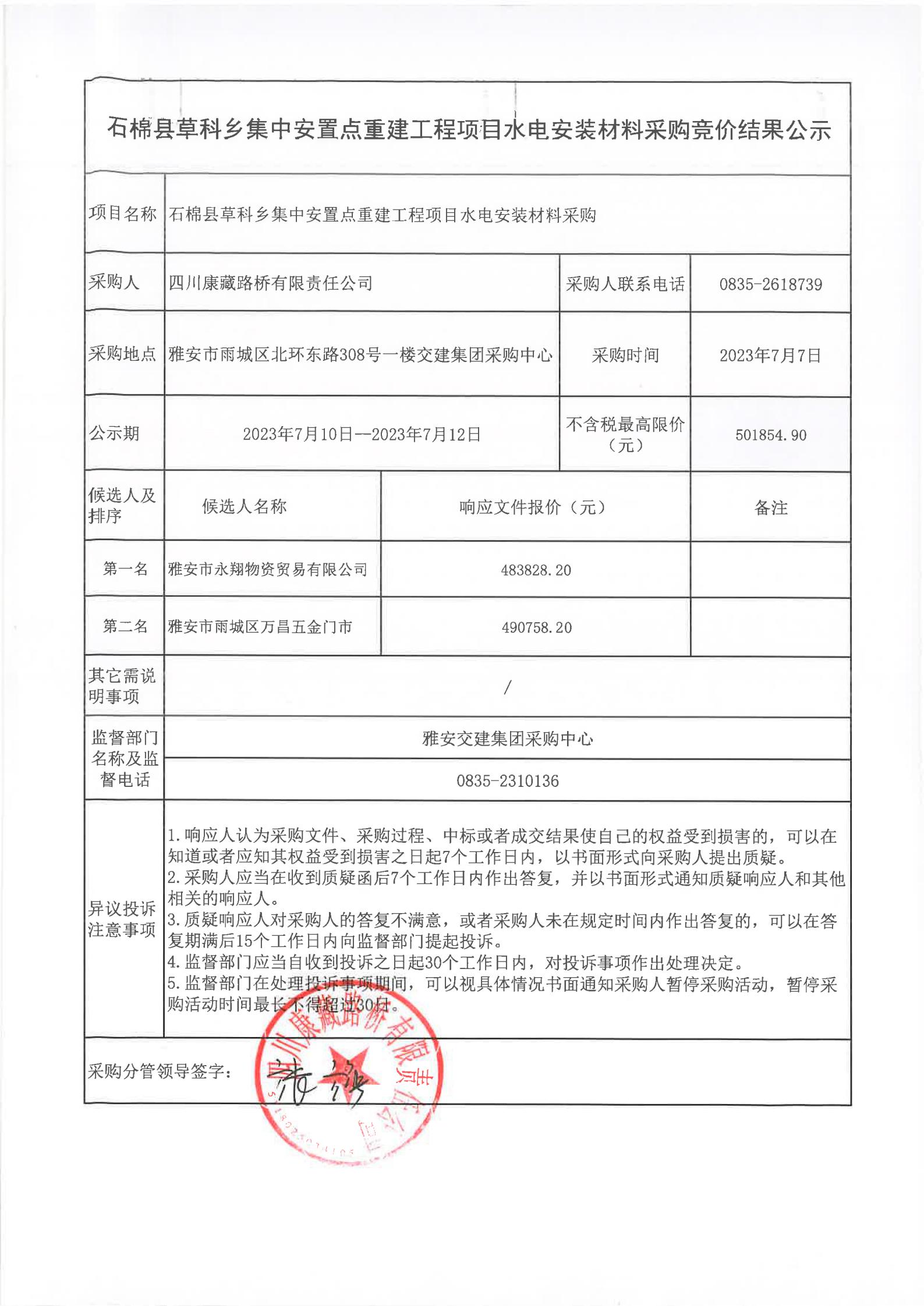 四川康藏路橋有限責(zé)任公司石棉草科鄉(xiāng)集中安置點(diǎn)重建工程項(xiàng)目水電安裝材料采購(gòu)競(jìng)價(jià)結(jié)果公示