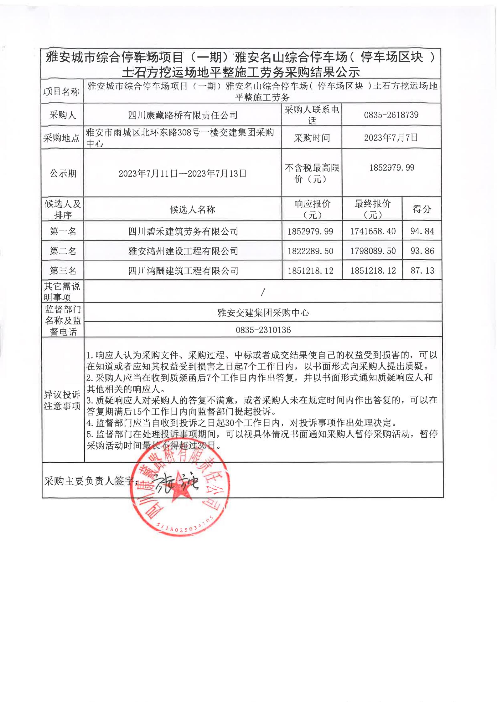 四川康藏路橋有限責任公司雅安城市綜合停車場項目(一期)雅安名山綜合停車場(停車場區(qū)塊)土石方挖運場地平整施工勞務(wù)采購結(jié)果公示