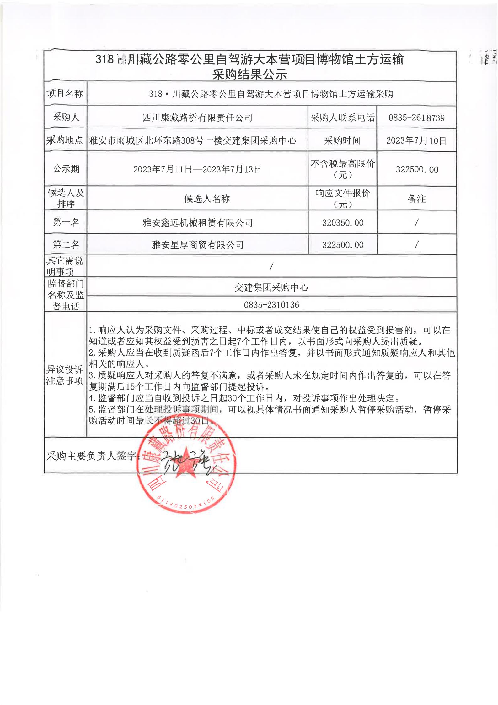 四川康藏路橋有限責(zé)任公司318·川藏公路零公里自駕游大本營項(xiàng)目博物館土方運(yùn)輸采購結(jié)果公示