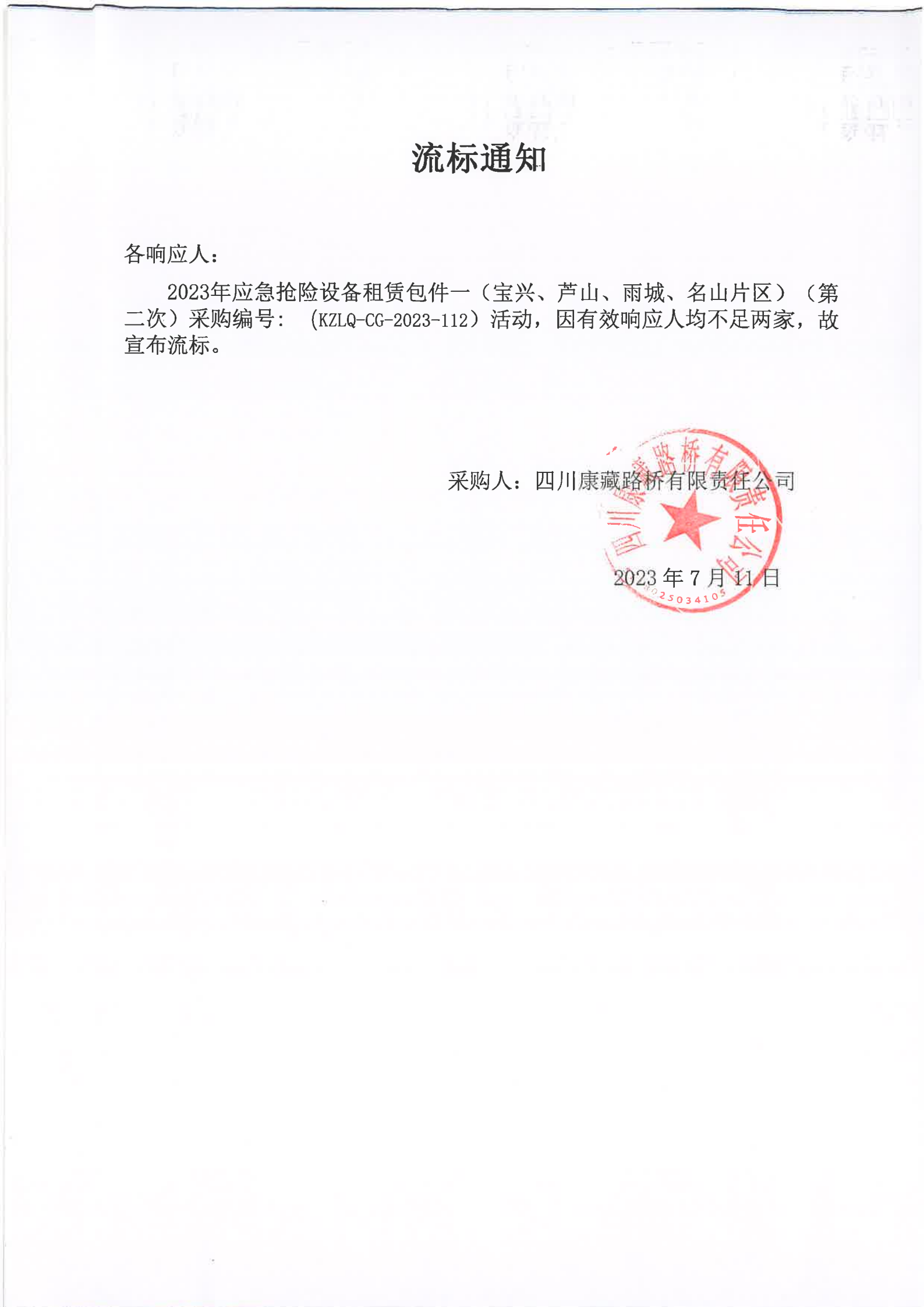 四川康藏路橋有限責任公司2023年應急搶險設備租賃包件一(寶興、蘆山、雨城、名山片區(qū))(第二次)流標通知