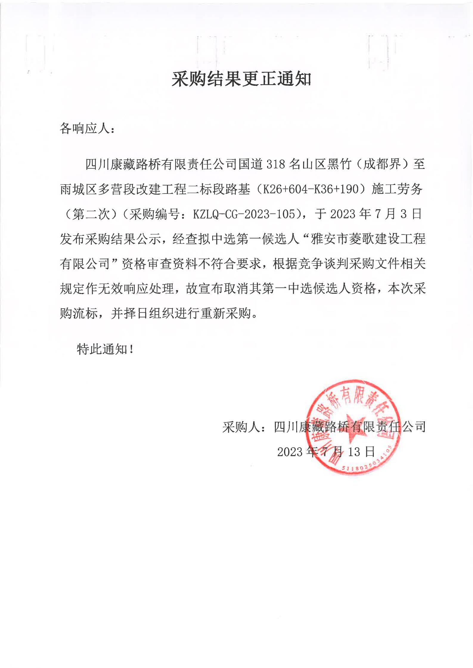 四川康藏路橋有限責(zé)任公司國道318名山區(qū)黑竹(成都界)至雨城區(qū)多營段改建工程二標(biāo)段路基(K26+604-K36+190)施工勞務(wù)(第二次)采購結(jié)果更正通知