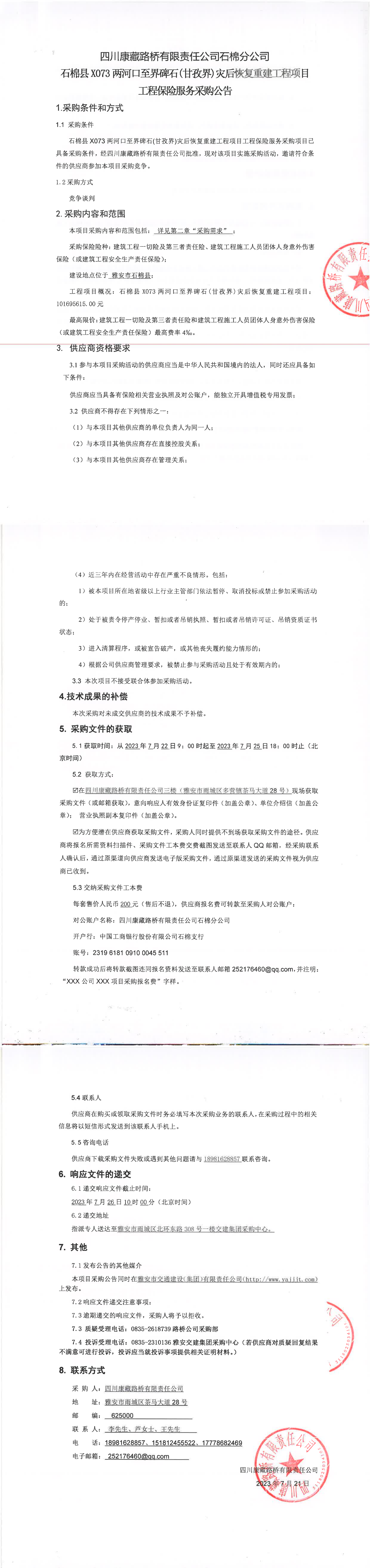 四川康藏路橋有限責(zé)任公司石棉縣X073兩河口至界碑石(甘孜界)災(zāi)后恢復(fù)重建工程項(xiàng)目工程保險(xiǎn)服務(wù)采購(gòu)公告