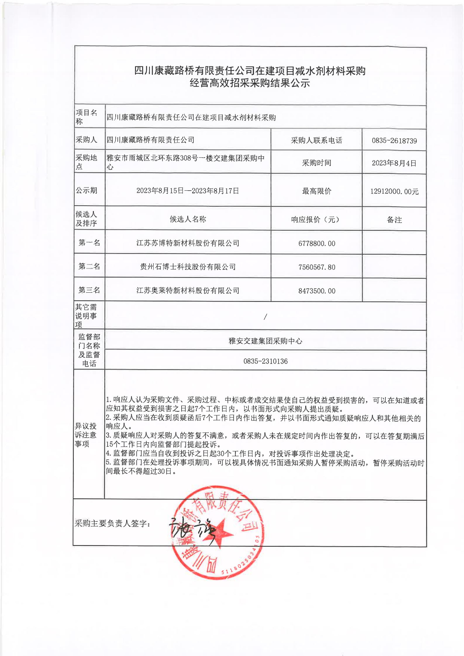 四川康藏路橋有限責任公司在建項目減水劑材料采購經(jīng)營高效招采采購結(jié)果公示