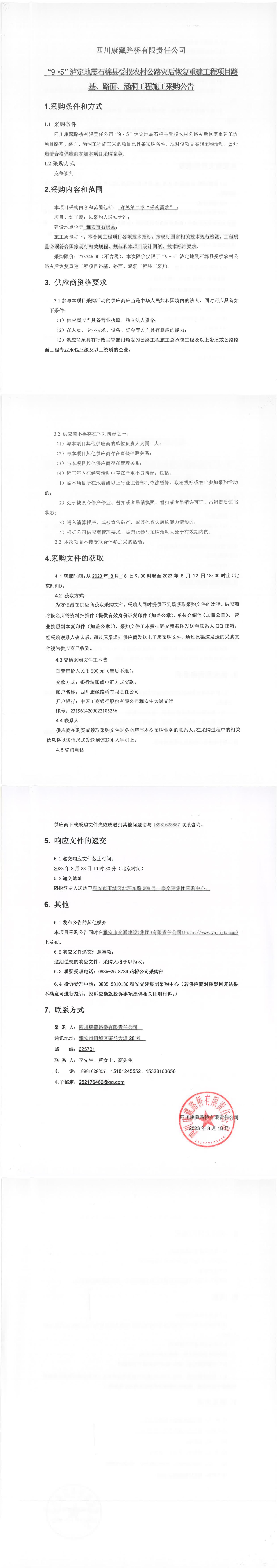 四川康藏路橋有限責(zé)任公司“9·5”瀘定地震石棉縣受損農(nóng)村公路災(zāi)后恢復(fù)重建工程項目路基、路面、涵洞工程施工采購公告