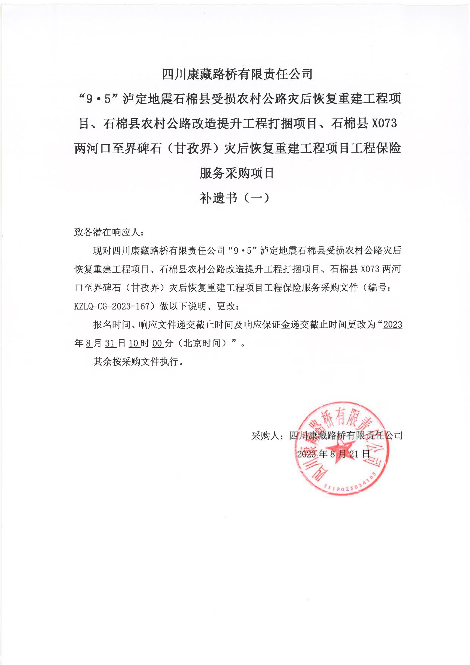 四川康藏路橋有限責任公司“9·5”瀘定地震石棉縣受損農(nóng)村公路災后恢復重建工程項目、石棉縣農(nóng)村公路改造提升工程打捆項目、石棉縣X073兩河口至界碑石(甘孜界)災后恢復重建工程項目工程保險服務采購項目補遺書(一)