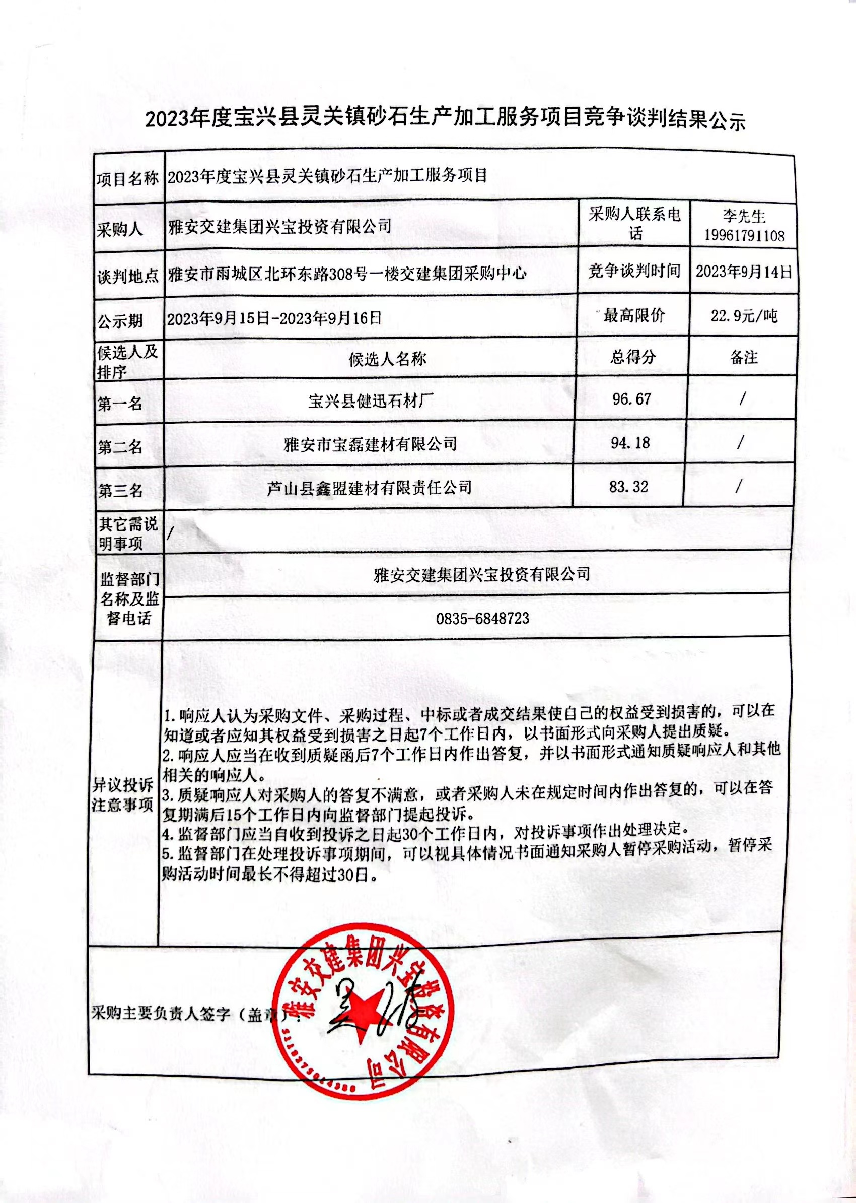 雅安交建集團(tuán)興寶投資有限公司2023年度寶興縣靈關(guān)鎮(zhèn)砂石生產(chǎn)加工服務(wù)項(xiàng)目競(jìng)爭(zhēng)談判結(jié)果公示
