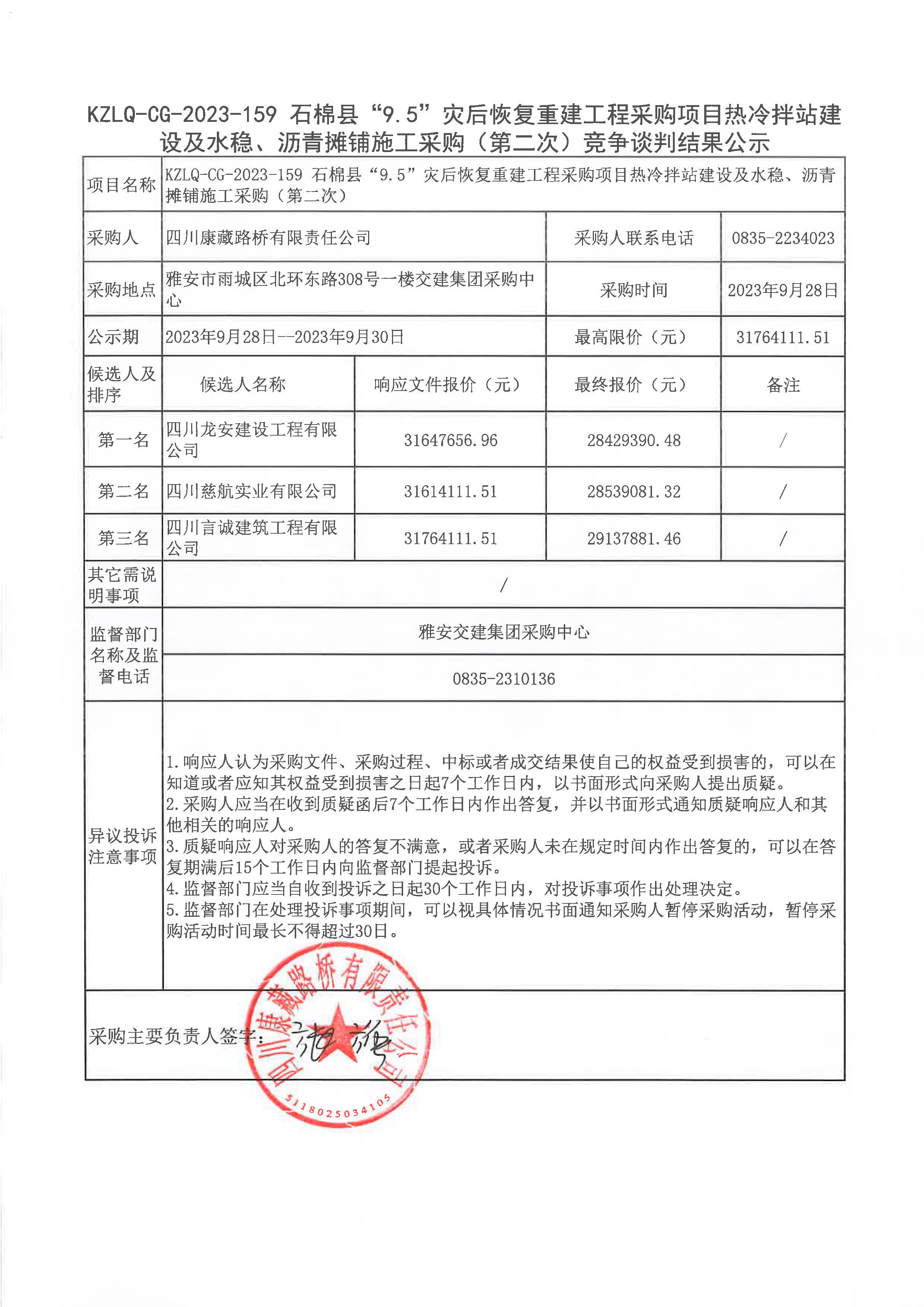 四川康藏路橋有限責(zé)任公司石棉縣“9.5”災(zāi)后恢復(fù)重建工程采購(gòu)項(xiàng)目熱冷拌站建設(shè)及水穩(wěn)、瀝青攤鋪施工采購(gòu)(第二次)競(jìng)爭(zhēng)談判結(jié)果公示