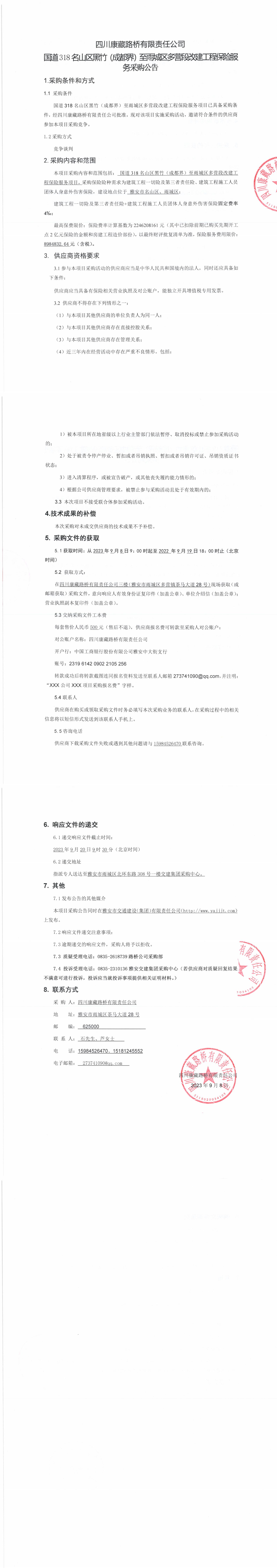 四川康藏路橋有限責(zé)任公司國道318名山區(qū)黑竹(成都界)至雨城區(qū)多營段改建工程保險(xiǎn)服務(wù)采購公告