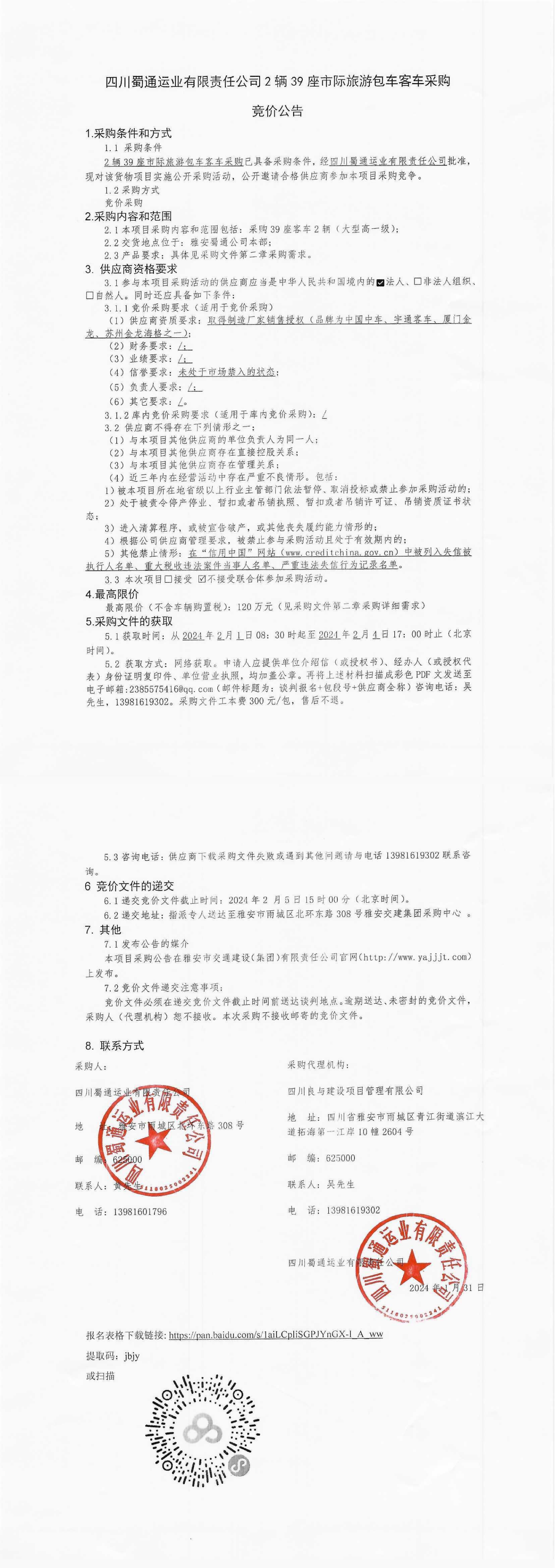 四川蜀通運(yùn)業(yè)有限責(zé)任公司2輛39座市際旅游包車客車采購(gòu)競(jìng)價(jià)公告