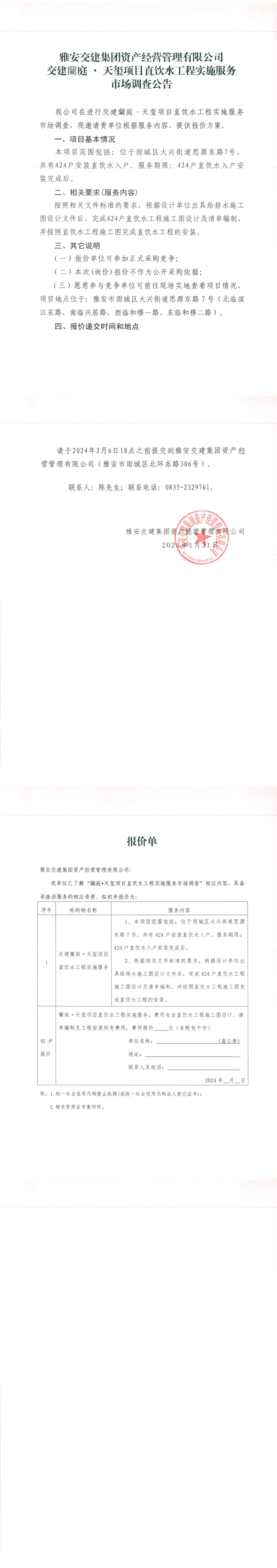雅安交建集團(tuán)資產(chǎn)經(jīng)營管理有限公司交建蘭庭·天璽項(xiàng)目直飲水工程實(shí)施服務(wù)市場調(diào)查公告