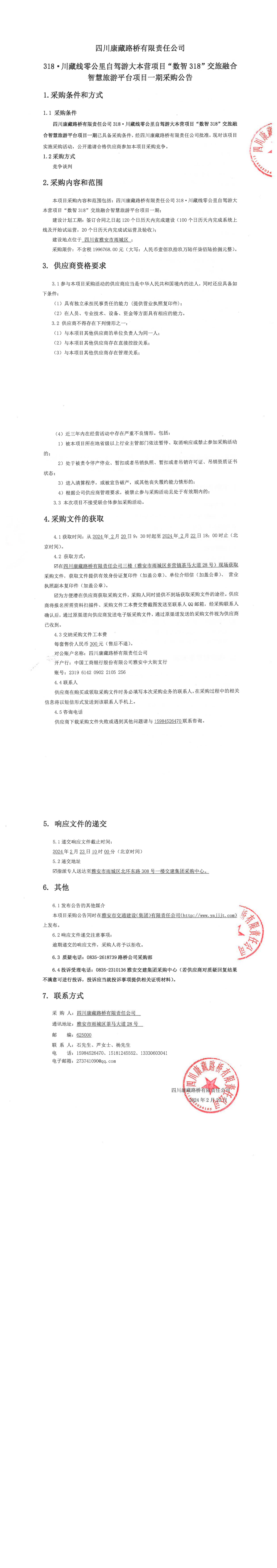 四川康藏路橋有限責(zé)任公司318·川藏線零公里自駕游大本營項目“數(shù)智318”交旅融合智慧旅游平臺項目一期采購公告