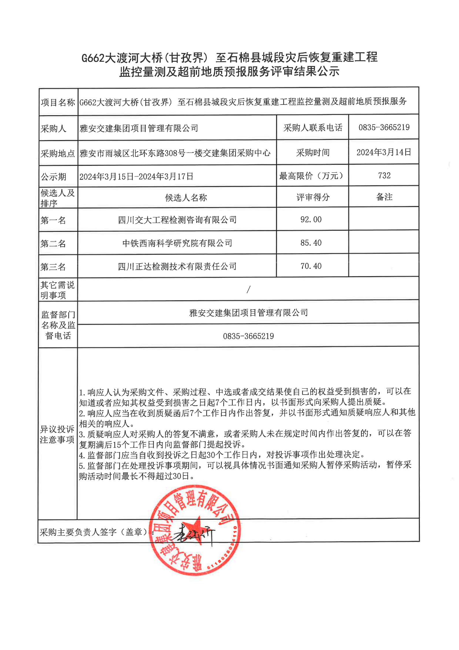 雅安交建集團項目管理有限公司G662大渡河大橋(甘孜界)至石棉縣城段災(zāi)后恢復(fù)重建工程監(jiān)控量測及超前地質(zhì)預(yù)報服務(wù)評審結(jié)果公示