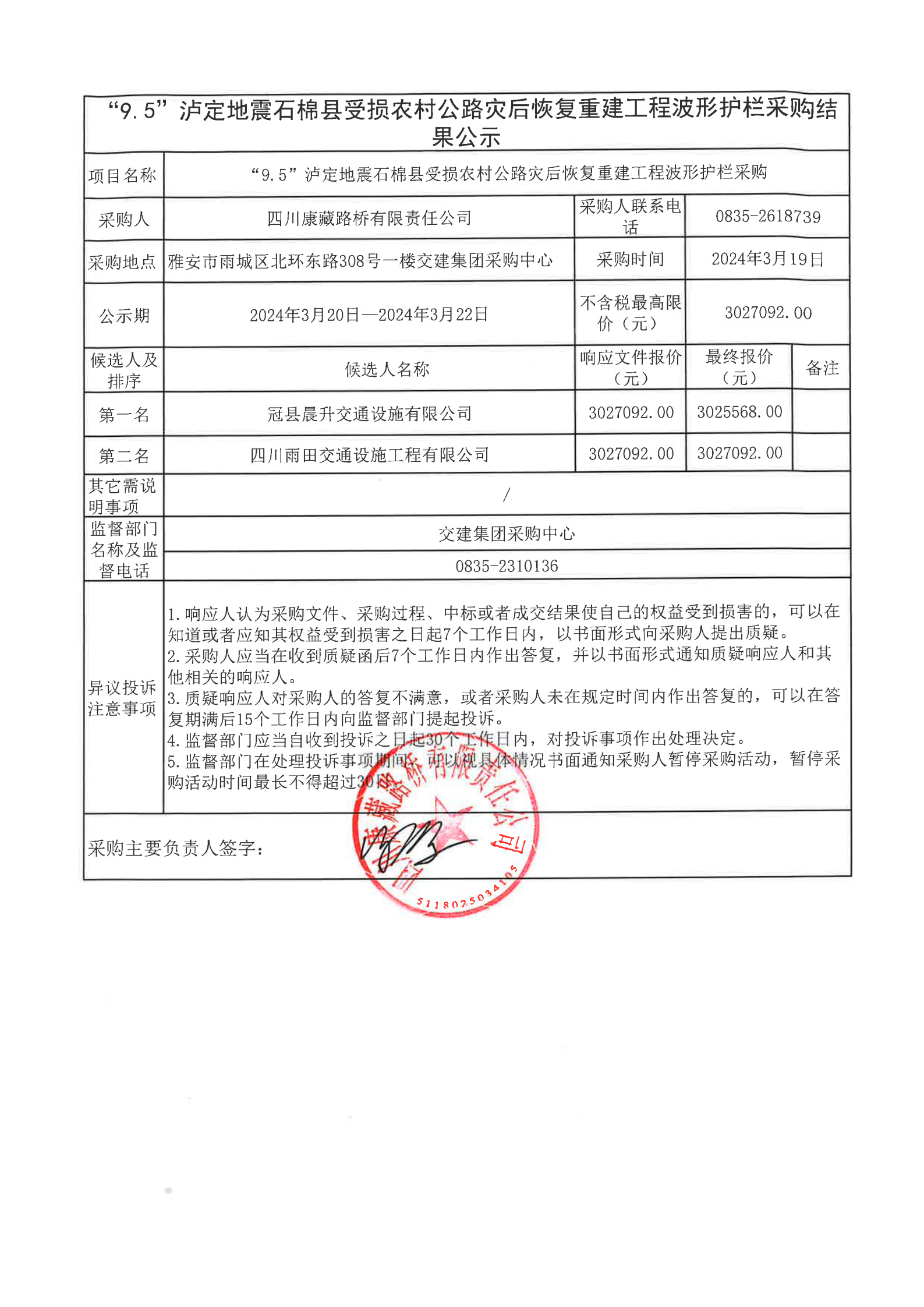 四川康藏路橋有限責(zé)任公司“9.5”瀘定地震石棉縣受損農(nóng)村公路災(zāi)后恢復(fù)重建工程波形護(hù)欄采購(gòu)結(jié)果公示
