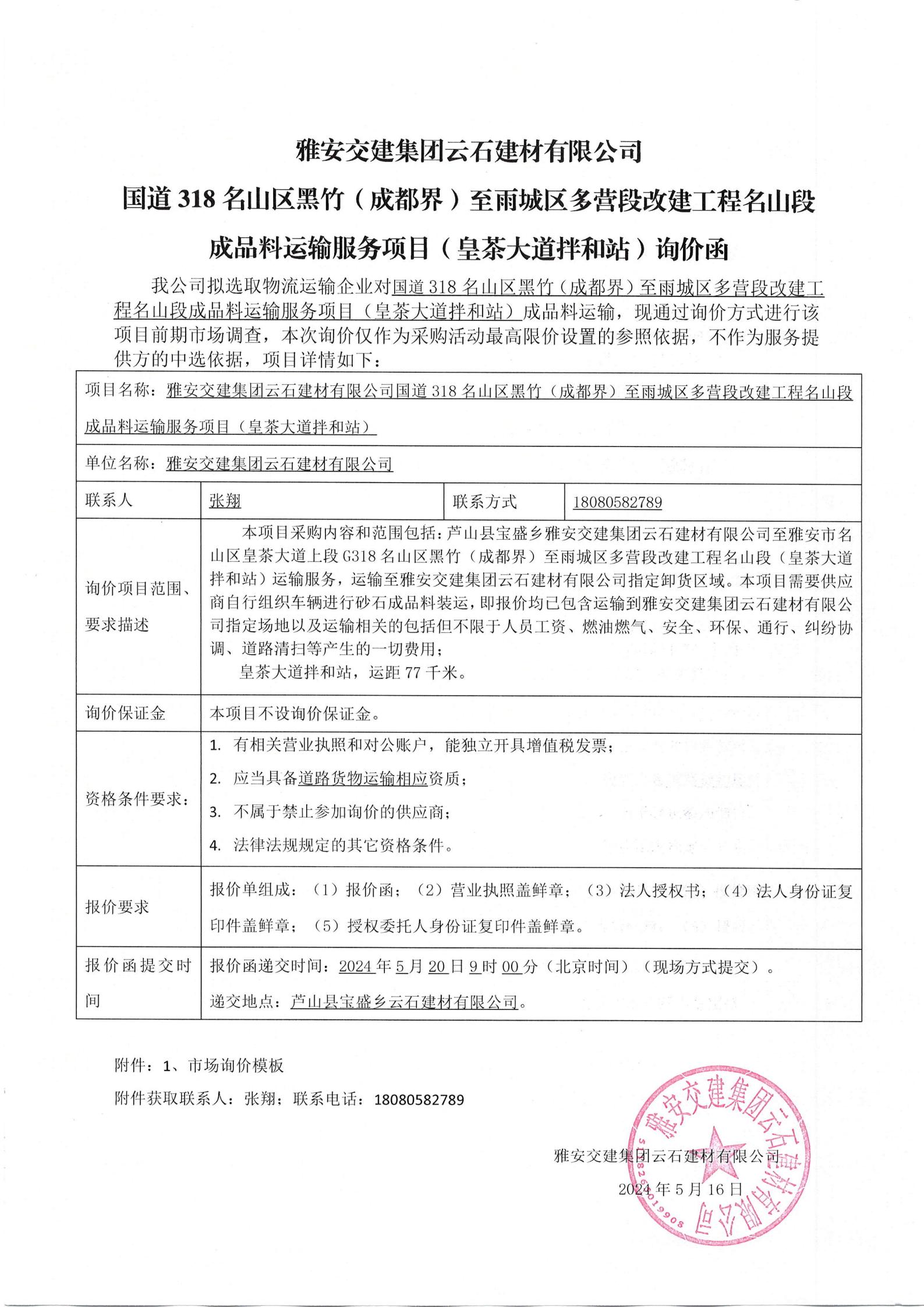 雅安交建集團云石建材有限公司國道318名山區(qū)黑竹(成都界)至雨城區(qū)多營段改建工程名山段成品料運輸服務(wù)項目(皇茶大道拌和站)詢價函