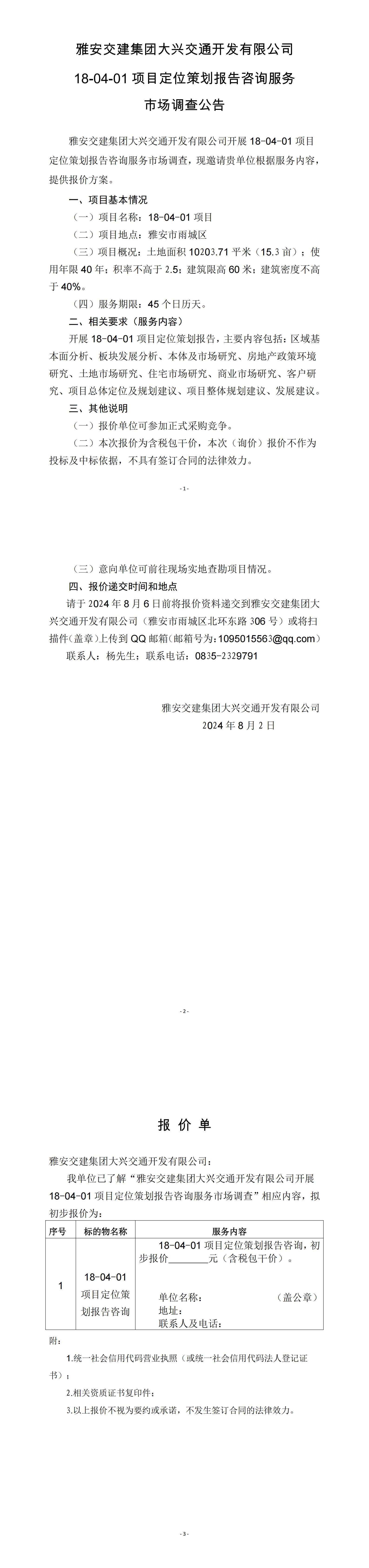 雅安交建集團大興交通開發(fā)有限公司18-04-01項目定位策劃報告咨詢服務市場調查公告