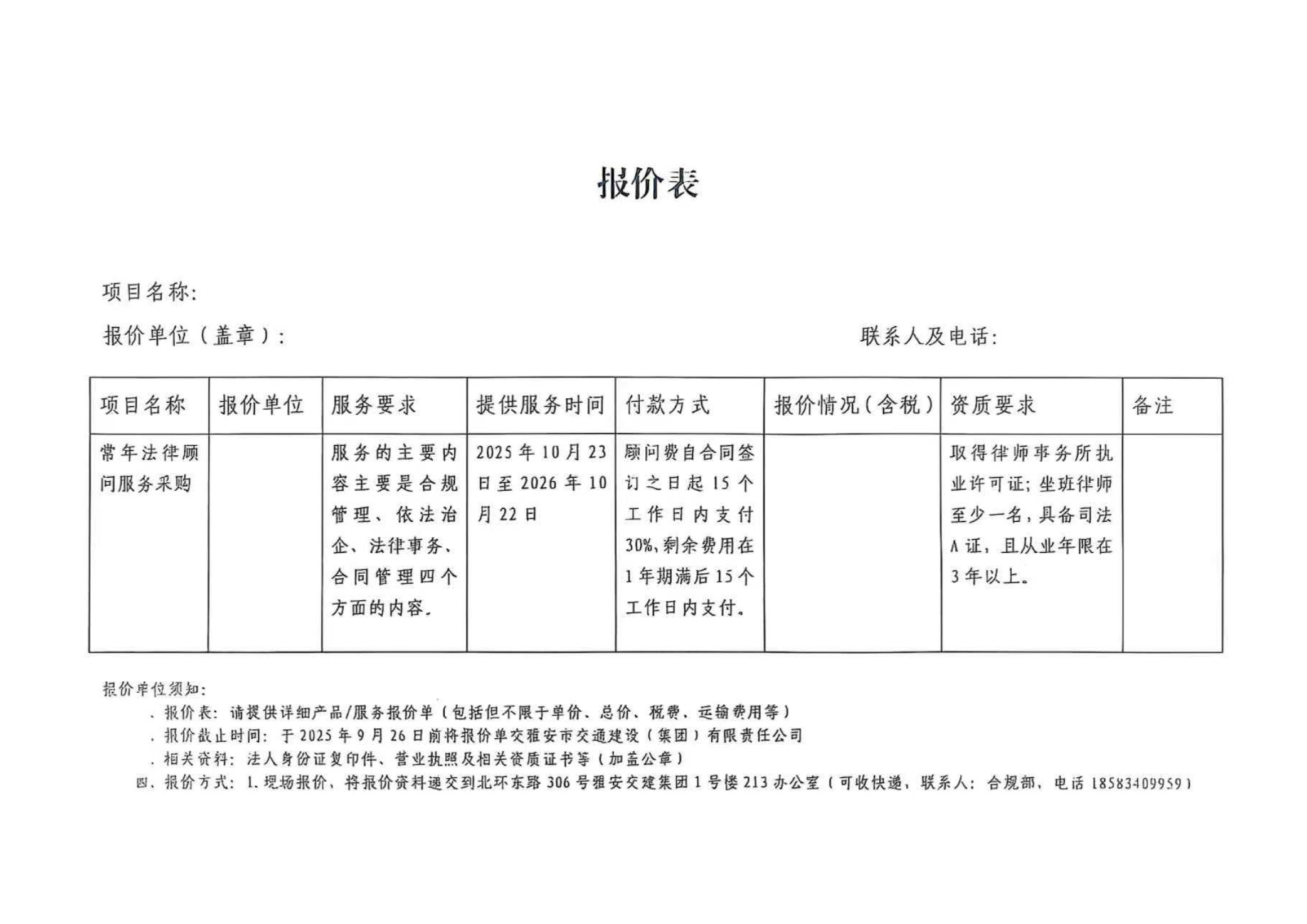 關于雅安市交通建設(集團)有限責任公司常年法律顧問服務的詢價函