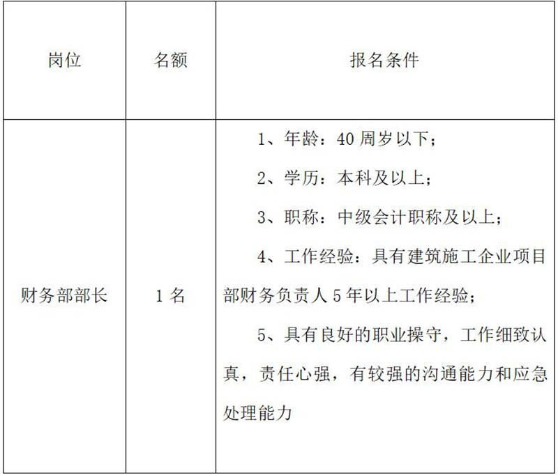 雅安交建集團(tuán)路橋有限責(zé)任公司是雅安市交通建設(shè)(集團(tuán))有限責(zé)任公司下屬子公司,主要從事道路、橋梁修建,F(xiàn)根據(jù)公司業(yè)務(wù)發(fā)展需要,擬向社會(huì)公開(kāi)招聘1名財(cái)務(wù)部部長(zhǎng),現(xiàn)將有關(guān)事項(xiàng)公告如下: