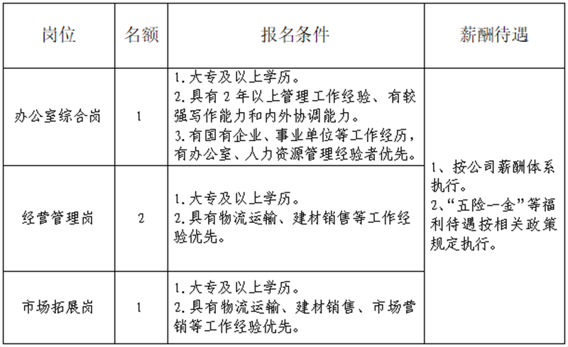 雅安交建集團運通貿(mào)易有限公司是雅安市交通建設(shè)(集團)有限責任公司下屬子公司。主要從事普通貨運、建材銷售、供應(yīng)鏈管理、貨運代理、貨運信息咨詢服務(wù)、倉儲配送服務(wù)等工作,F(xiàn)根據(jù)公司業(yè)務(wù)發(fā)展需要,決定招聘4名工作人員,現(xiàn)將有關(guān)事項公告如下: