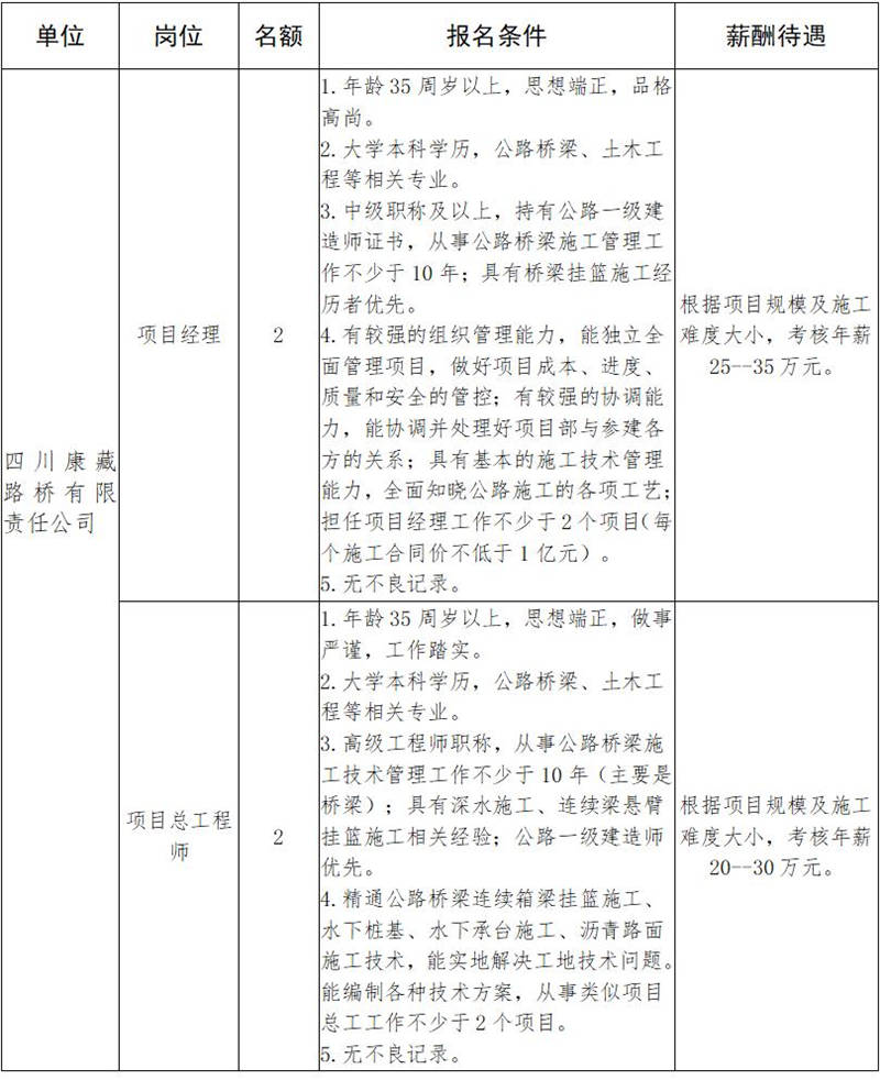 根據(jù)發(fā)展需要,決定面向社會公開招聘雅安市交通建設(shè)(集團)有限責(zé)任公司(以下簡稱“雅安交建集團”)所屬子公司工程項目主要負(fù)責(zé)人10名,現(xiàn)將有關(guān)事項公告如下: