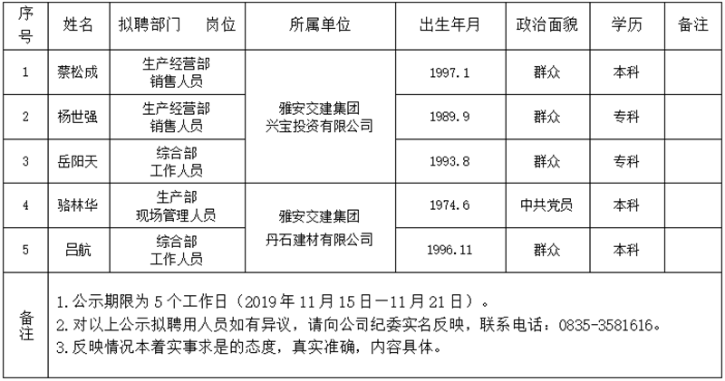 雅安交建集團(tuán)所屬子公司擬聘用人員公示(興寶公司、丹石公司)