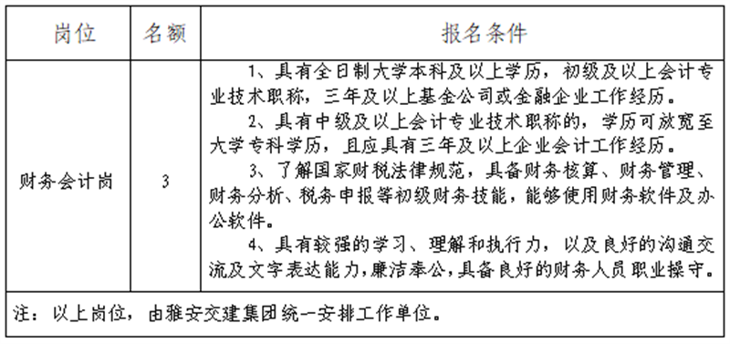根據(jù)發(fā)展需要,決定面向社會公開招聘雅安市交通建設(shè)(集團)有限責任公司(以下簡稱“雅安交建集團”)所屬子公司財務(wù)工作人員3名,現(xiàn)將有關(guān)事項公告如下: