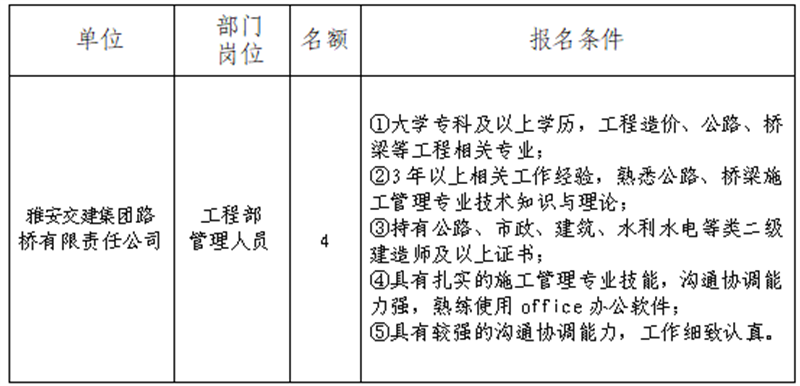 根據(jù)發(fā)展需要,決定面向社會(huì)公開招聘雅安市交通建設(shè)(集團(tuán))有限責(zé)任公司(以下簡稱“雅安交建集團(tuán)”)所屬子公司工作人員4名,現(xiàn)將有關(guān)事項(xiàng)公告如下: