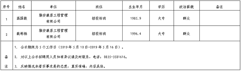 雅安交建集團子公司擬聘用人員公示(康居公司)