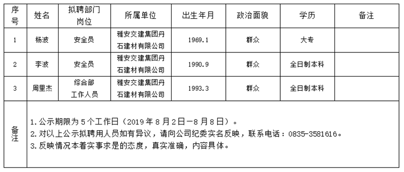 雅安交建集團子公司擬聘用人員公示(丹石建材公司)