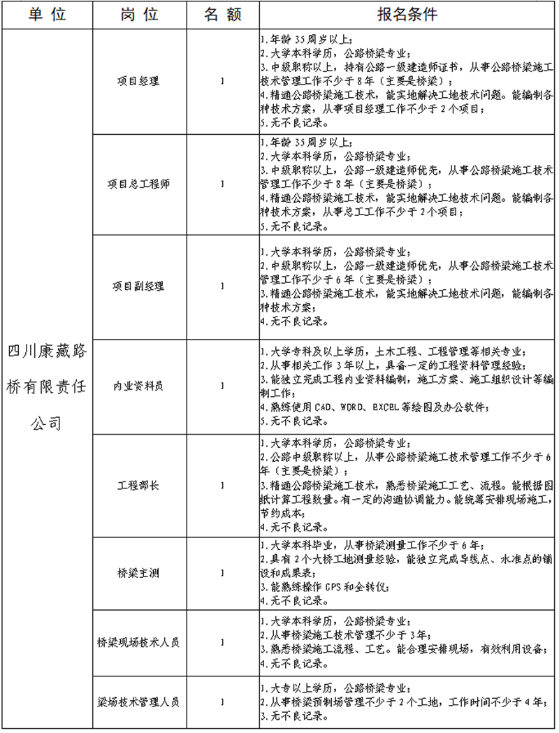 根據(jù)公司業(yè)務(wù)發(fā)展需要,決定面向社會公開招聘省道104線草壩至姚橋段改建項目部專業(yè)技術(shù)人才8名,現(xiàn)將有關(guān)事項公告如下: