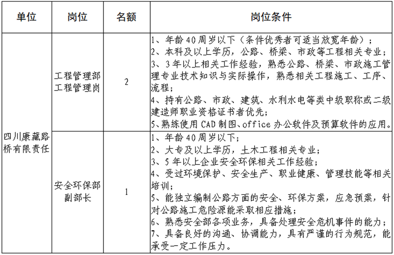 雅安交建集團關(guān)于公開招聘所屬子公司工作人員的公告(路橋公司)