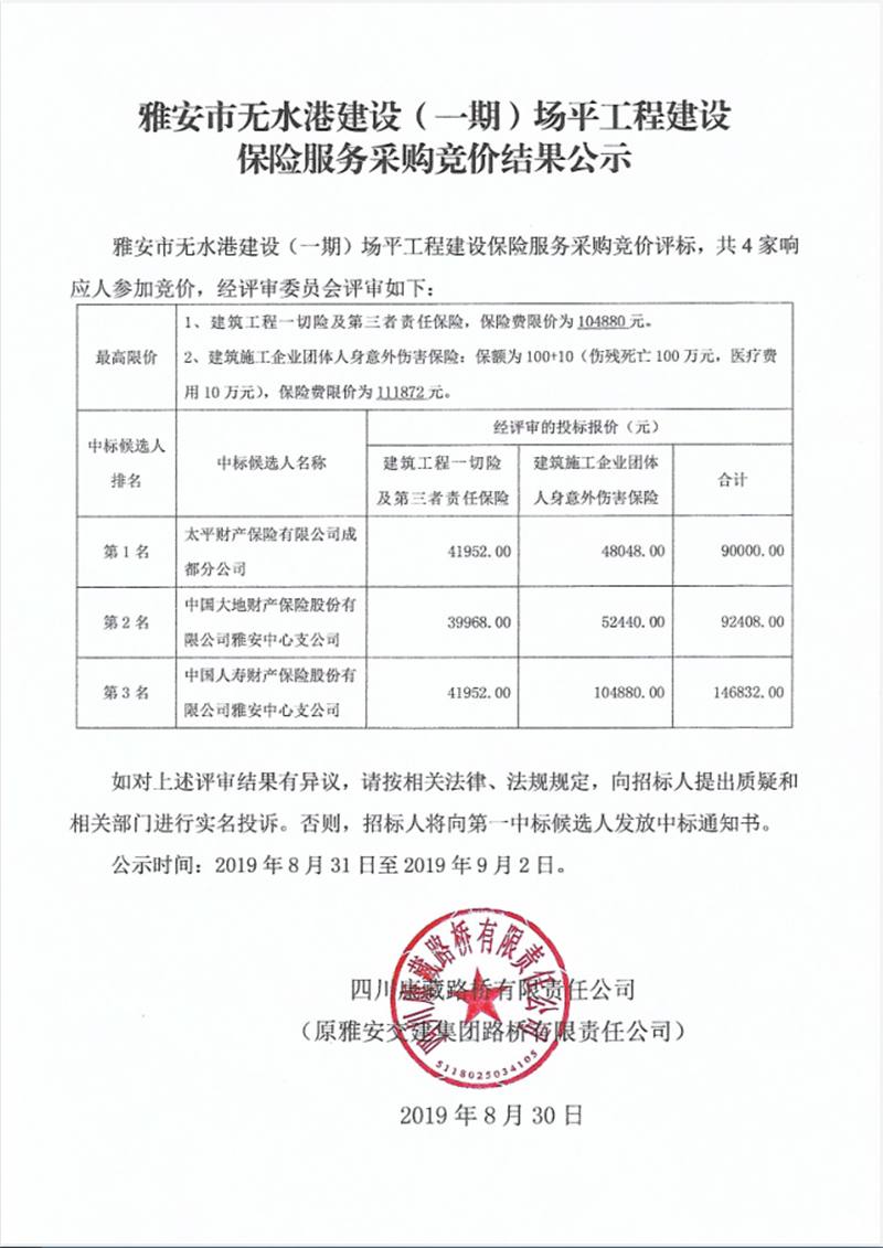 雅安市無水港建設(shè)(一期)場(chǎng)平工程建設(shè)保險(xiǎn)服務(wù)采購競(jìng)價(jià)結(jié)果公示