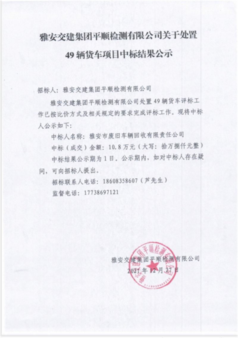 雅安交建集團(tuán)平順檢測公司關(guān)于處置49輛貨車項目中標(biāo)結(jié)果公示