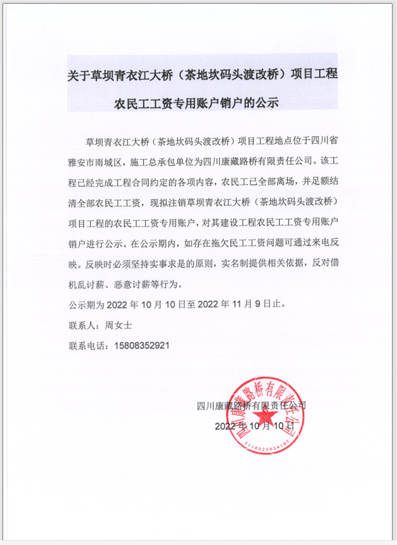 關(guān)于草壩青衣江大橋(茶地坎碼頭渡改橋)項目工程農(nóng)民工工資專用賬戶銷戶的公告