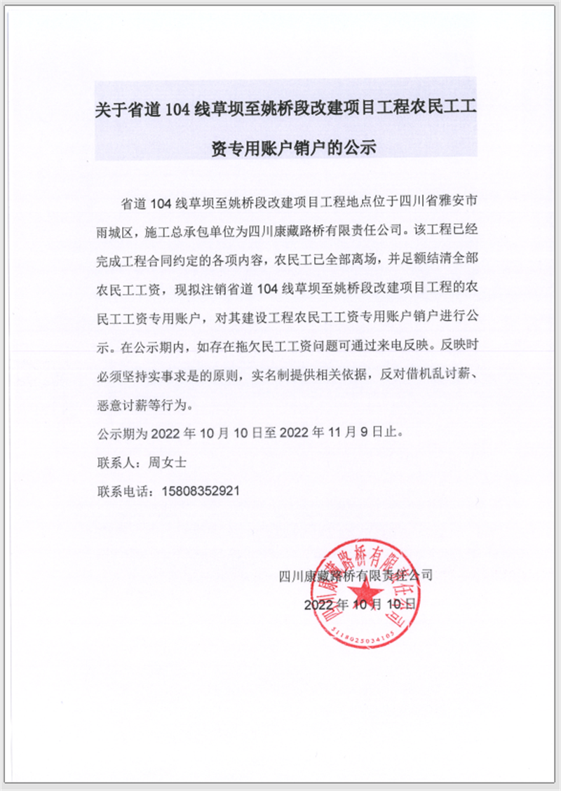 關(guān)于省道104線草壩至姚橋段改建項目工程農(nóng)民工工資專用賬戶銷戶的公告
