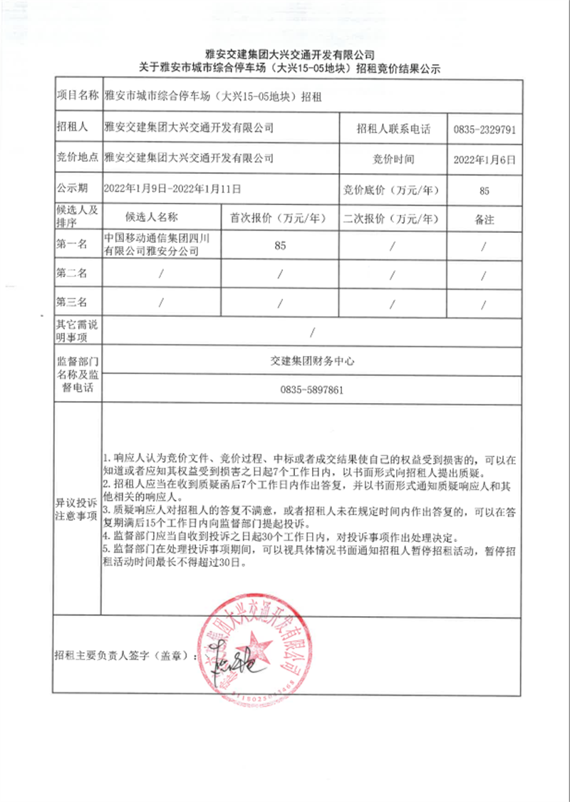 大興開發(fā)公司關(guān)于雅安市城市綜合停車場(大興15-05地塊)招租競價結(jié)果的公示