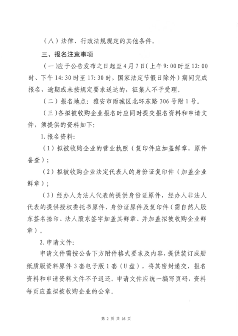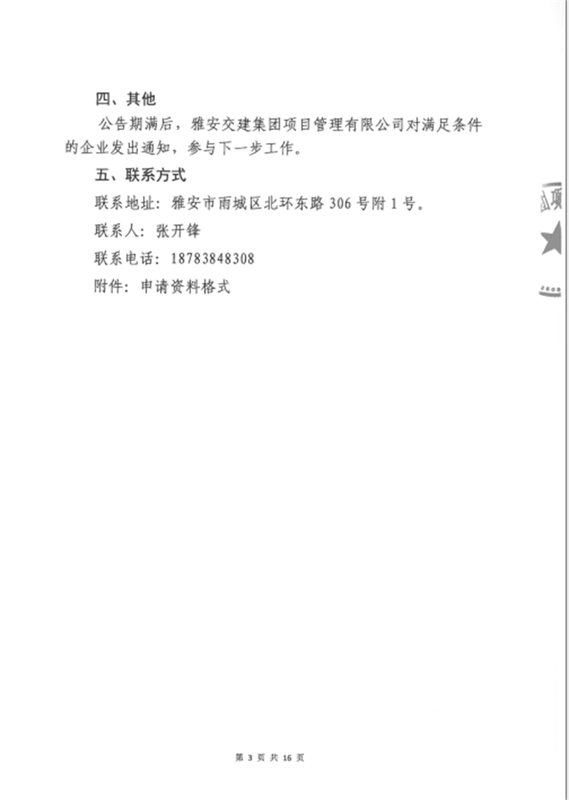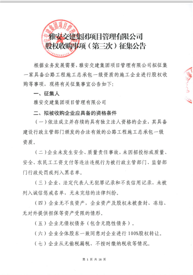 雅安交建集團項目管理有限公司股權(quán)收購事項(第三次)征集公告