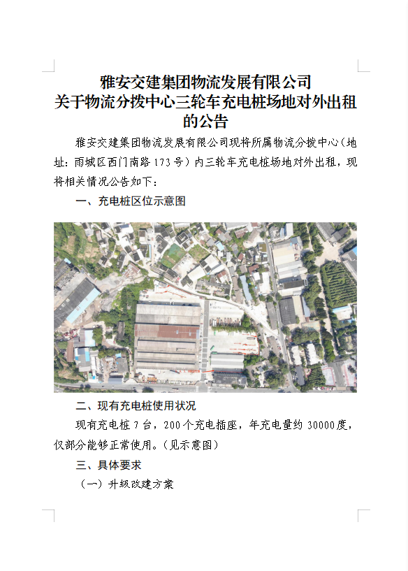 雅安交建集團(tuán)物流發(fā)展有限公司關(guān)于物流分撥中心三輪車(chē)充電樁場(chǎng)地對(duì)外出租的公告