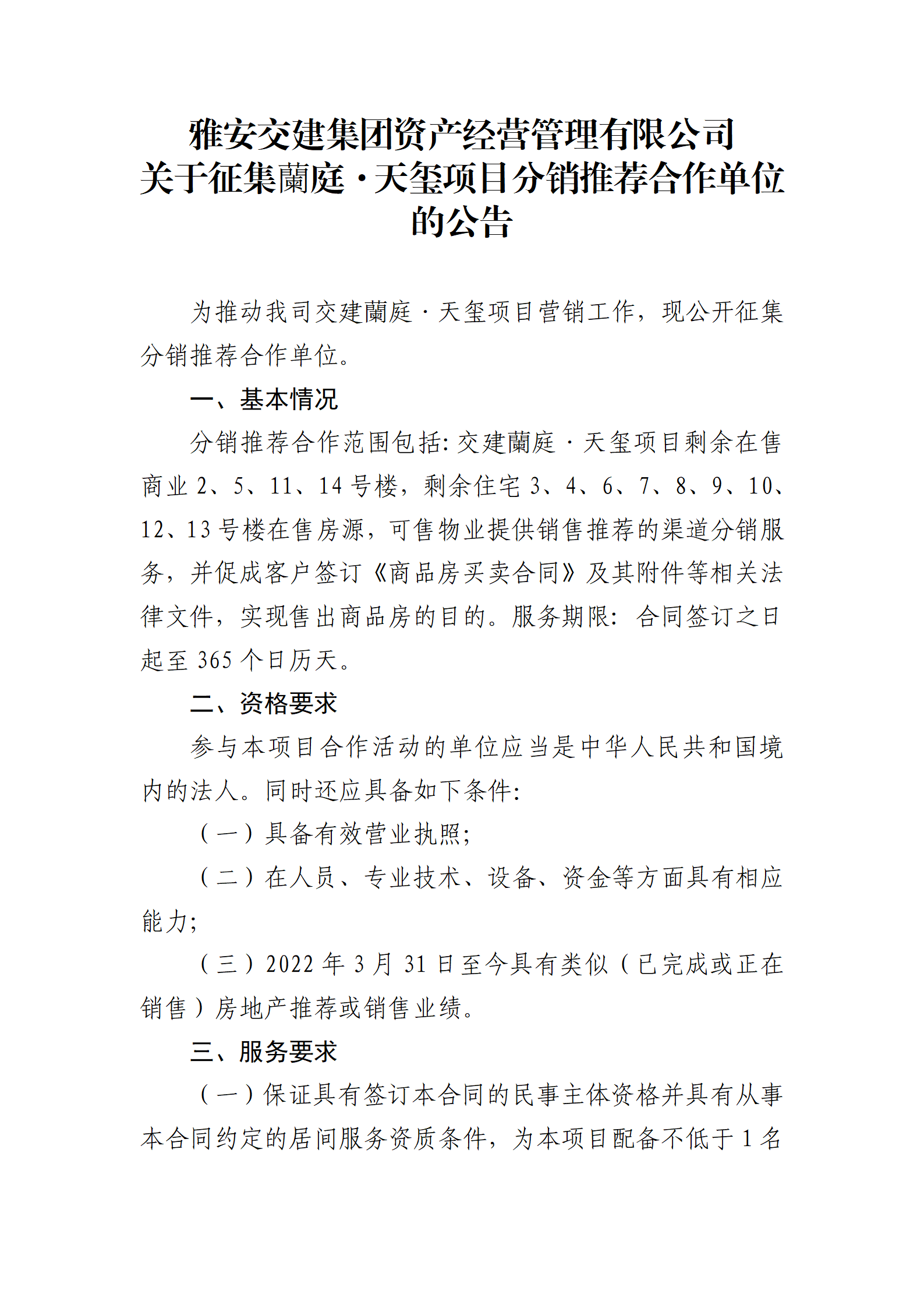 雅安交建集團(tuán)資產(chǎn)經(jīng)營(yíng)管理有限公司 關(guān)于征集蘭庭·天璽項(xiàng)目分銷推薦合作單位的公告