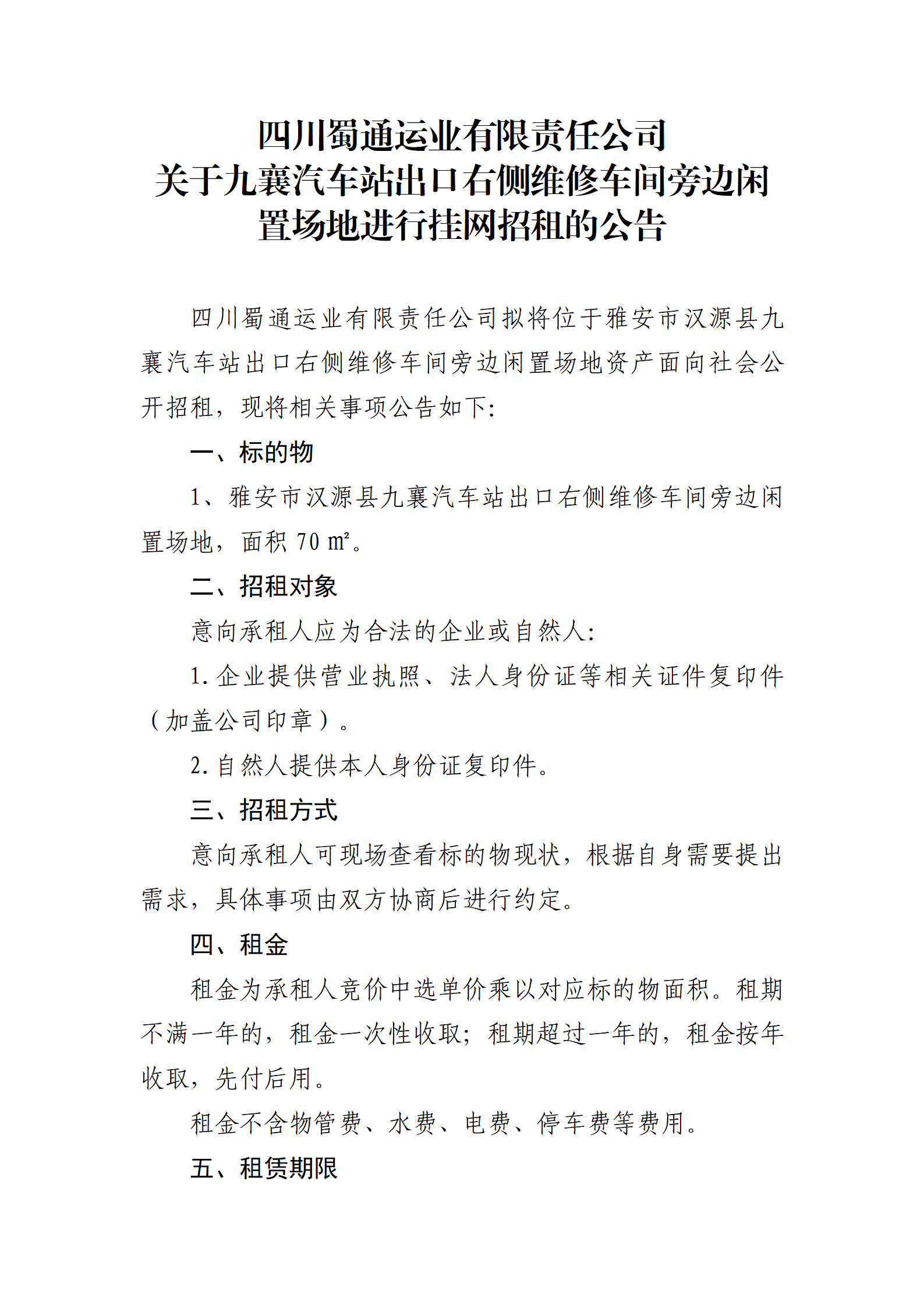 四川蜀通運(yùn)業(yè)有限責(zé)任公司 關(guān)于九襄汽車站出口右側(cè)維修車間旁邊閑置場地進(jìn)行掛網(wǎng)招租的公告