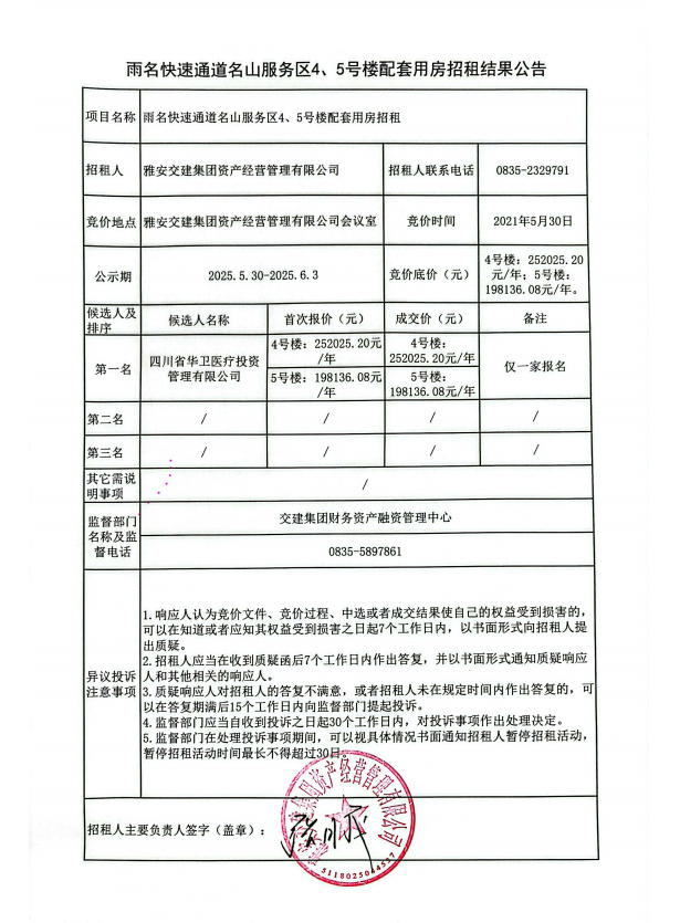 雨名快速通道名山服務(wù)區(qū)4、5號(hào)樓配套用房招租結(jié)果公告